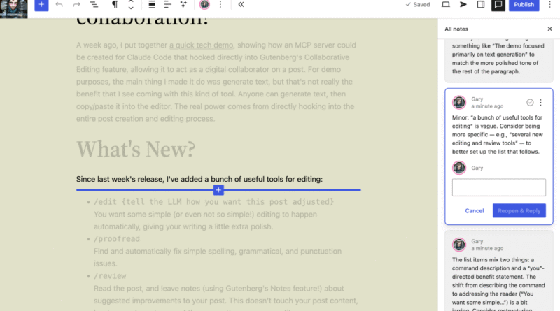 A week ago, I put together a quick tech demo, showing how an MCP server could be created for Claude Code that hooked directly into Gutenberg’s Collaborative Editing feature, allowing it to act as a digital collaborator on a post. The demo focused primarily on text generation, but that’s not really the benefit that I see coming with this kind of tool. Anyone can generate text, then copy/paste it into the editor. The real power comes from directly hooking into the entire post creation and editing process.